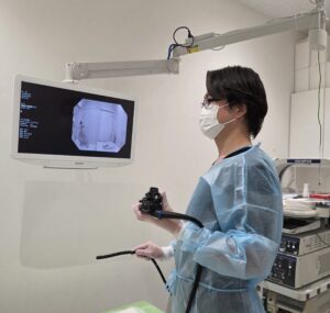 大腸カメラの模擬的な写真になりますが、当クリニックの内視鏡室です。